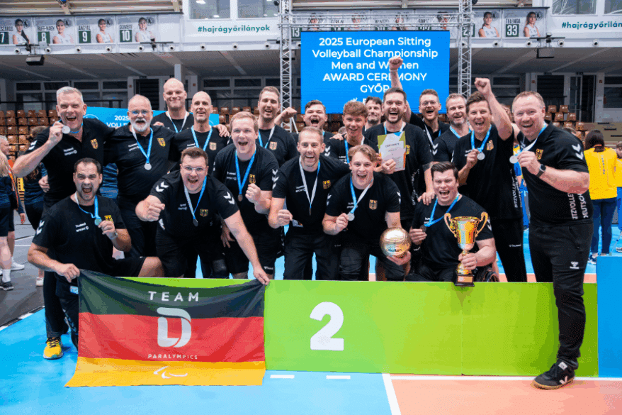 Die Trophäensammlung der deutschen Sitzvolleyballer ist um eine weitere Silbermedaille ergänzt worden. Bei den Europameisterschaften im ungarischen Györ stürmte das Herren-Team von Cheftrainer Christoph Herzog mit klaren Siegen bis ins Finale. Dort war dann erwartungsgemäß der große Favorit aus Bosnien und Herzegowina zu stark und setzte sich mit 3:0 durch, auch wenn die ersten beiden Sätze hart umkämpft waren (23:25 / 22:25 / 18:25)
